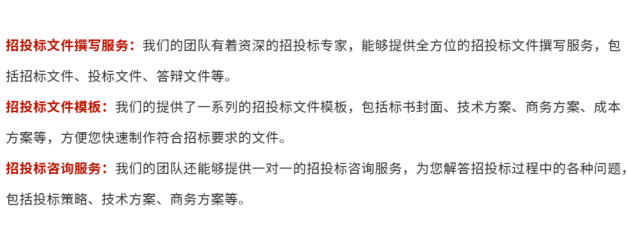 招投標(biāo)文件撰寫(xiě)服務(wù):我們的團(tuán)隊(duì)有著資深的招投標(biāo)專(zhuān)家,能夠提供全方位的招投標(biāo)文件撰寫(xiě)服務(wù),包括招標(biāo)文件、投標(biāo)文件、答辯文件等。