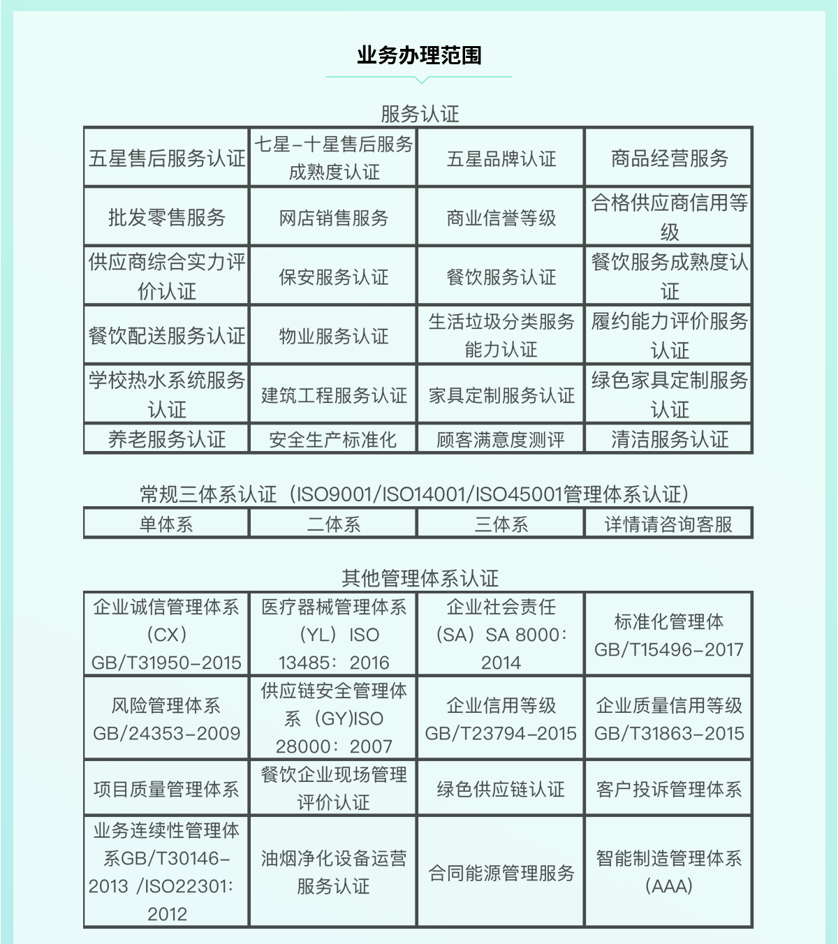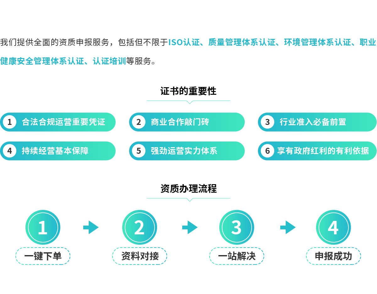 我們提供全面的資質(zhì)申報(bào)服務(wù),包括但不限于ISO認(rèn)證、質(zhì)量管理體系認(rèn)證、環(huán)境管理體系認(rèn)證、職業(yè)健康安全管理體系認(rèn)證、認(rèn)證培訓(xùn)等服務(wù)。