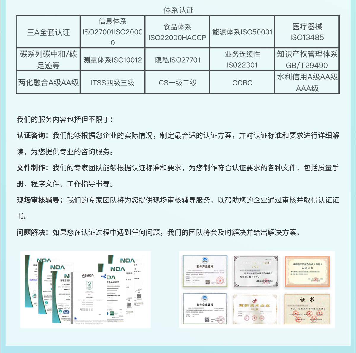 認(rèn)證咨詢:我們能夠根據(jù)您企業(yè)的實(shí)際情況,制定最合適的認(rèn)證方案,并對認(rèn)證標(biāo)準(zhǔn)和要求進(jìn)行詳細(xì)解讀,為您提供專業(yè)的咨詢服務(wù)。